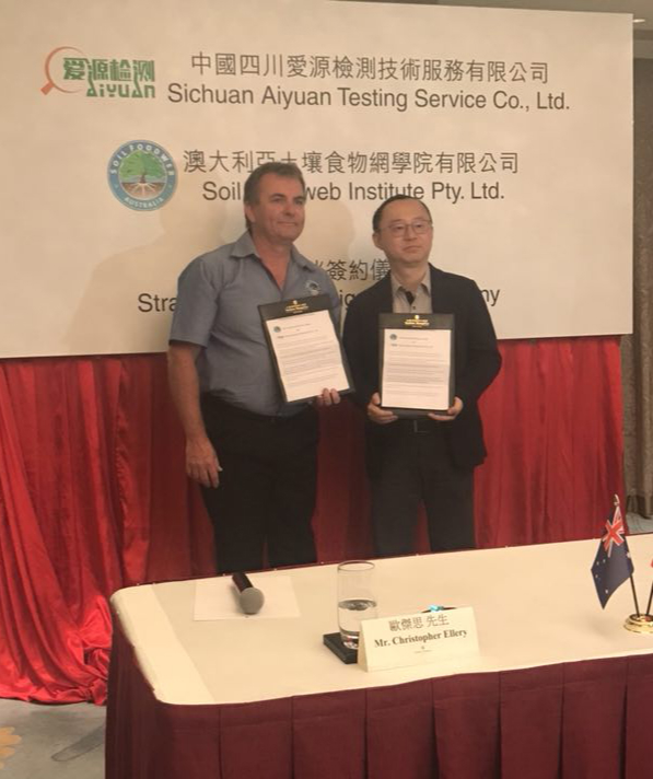 23日上午,薛品翰總裁出席四川愛源檢測中心與澳大利亞Soil Foodweb Institute公司合作簽約儀式,愛源檢測中心執(zhí)行董事黃煌與Soil Foodweb Institute公司CEO Chris Ellery 簽署雙方戰(zhàn)略合作協(xié)議書。